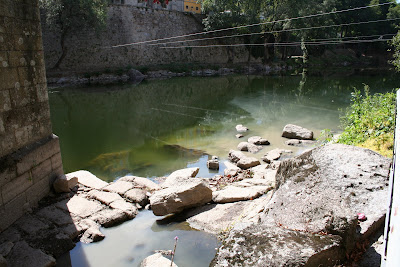 Ao que parece, e segundo o técnico da empresa Águas do Ave que vinha "resolver" o caso, a tubagem foi mal dimensionada e, de quando em vez, a pressão exercida pelo detritos é de tal ordem que rebenta com umas tampas que por lá existem na galeria técnica criando uma cascata imunda, nojenta e pestilenta que cai cá bem de cima, em pleno muro que sustenta o Largo de S. Gonçalo...