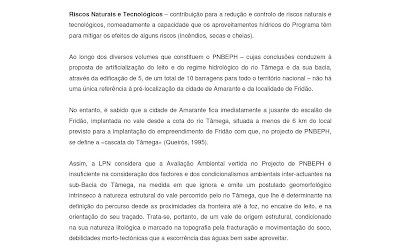 No plano apresentado pelo governo, temos extremas reservas relativamente a duas barragens que se situam dentro da área de actuação do Núcleo.