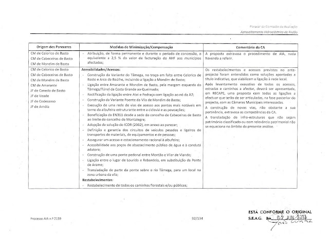 A análise do extracto (pp. 85 a 101) do Parecer que deu fundamento à Declaração de Impacte Ambiental (DIA) fica ao critério de quem a deseje efectuar pelos seus próprios meios, mas não deixa de ser tristemente interessante relevar dele a posição dos municípios de Basto (Cabeceiras, Celorico e Mondim) «Favorável à cota 160» à espera de contrapartidas, e a da Câmara Municipal de Amarante que escandalosamente «Não expressa posição clara» em sede de AIA, apesar das deliberações da Assembleia Municipal pela rejeição da barragem e das duas moções com igual sentido posicional aprovadas por unanimidade no órgão executivo do ocupado Município de Amarante.